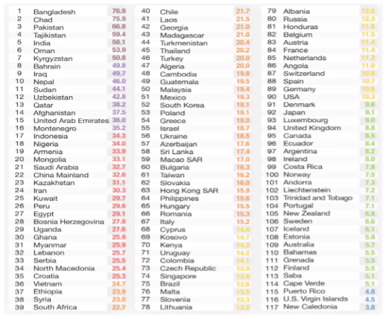 Using the same colour scheme, the following table ranks the countries’ population weighted, 2021 average PM2.5 concentration (μg/m³) in descending order.