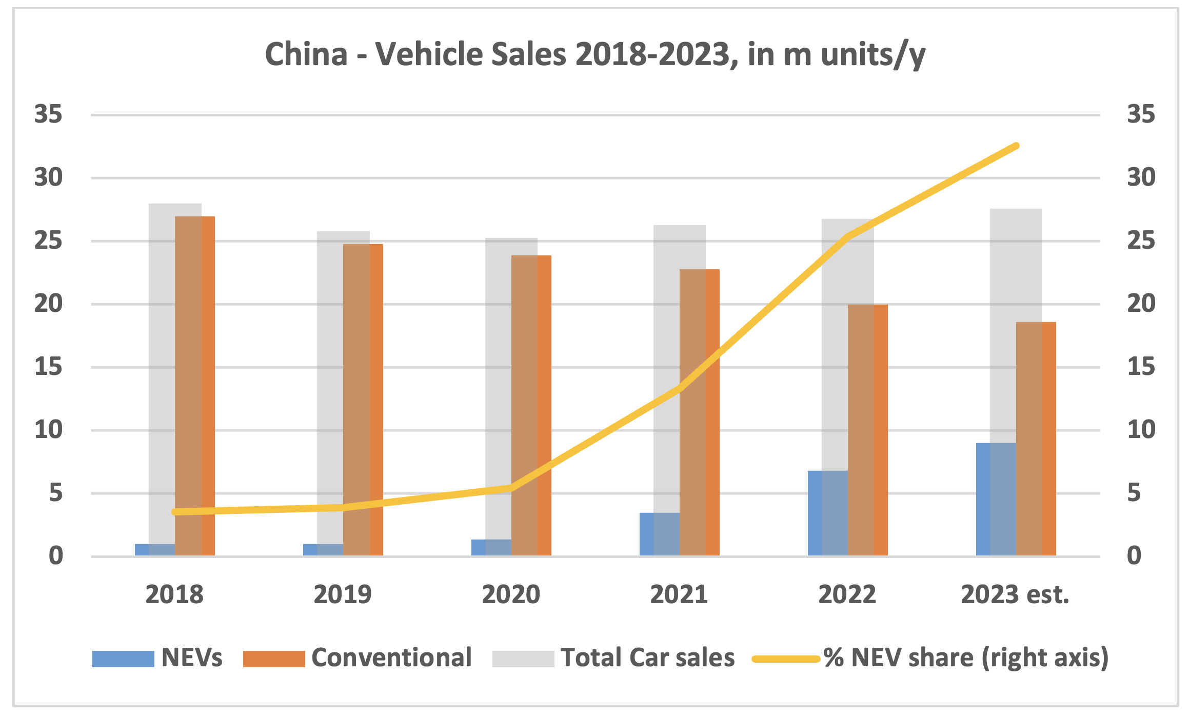 While China expects a steep recovery of around 10% in domestic refined fuel demand this year, the growth will predominantly come from the jet fuel segment, while year-round diesel and gasoline sales are set for a marginal increase only. According to China’s Automobile Association, sales of NEVs are expected to reach 9m units in 2023, making this a market share of 32.6% in the overall market, up from an average share of 27.6% in 2022. Other analysts indicate a market share of up to 35%.