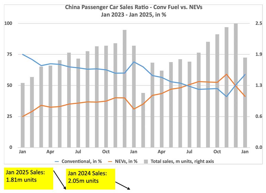 The chart underneath shows the January 2023 - January 2025 sales data for new passenger cars and their market share split between NEVs and conventional other fuel car types in China.