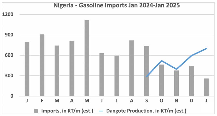 The chart underneath shows how the Dangote start-up has impacted gasoline imports between January 2024 and January 2025.