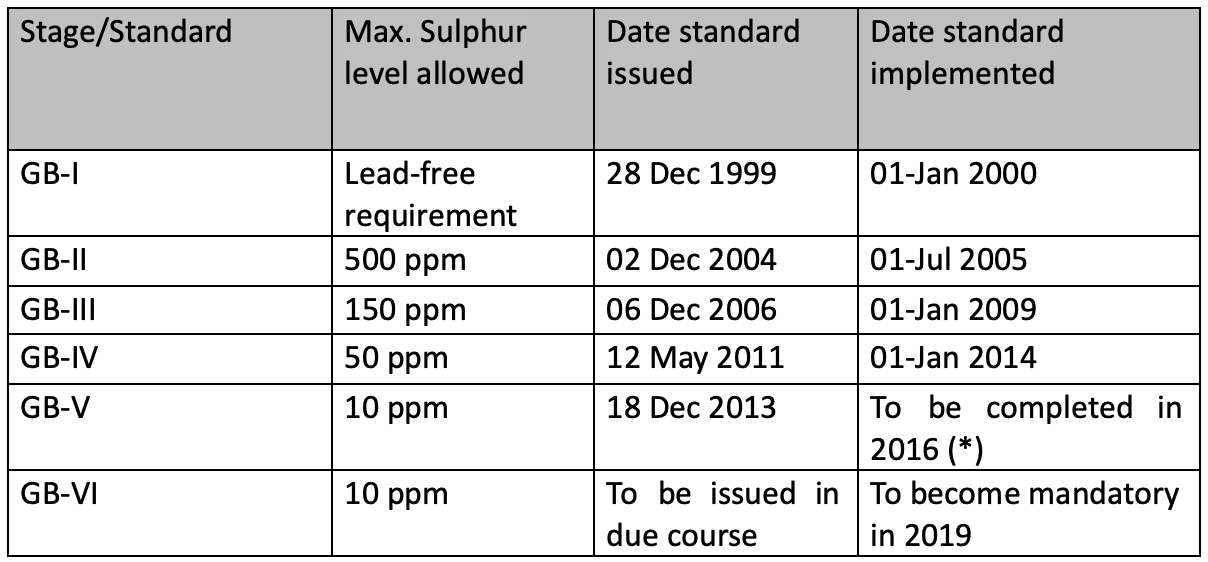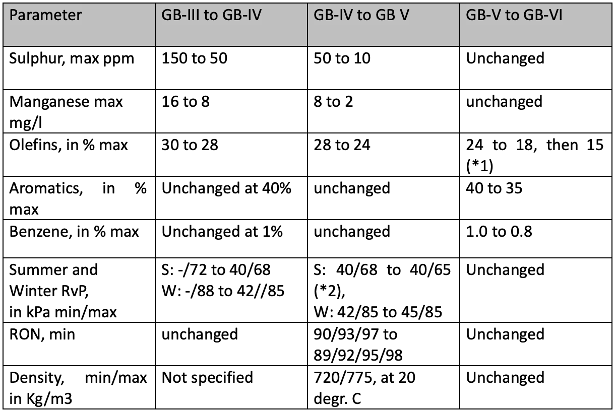 GB-I was mainly targeting the nationwide lead-phase out while GB-II to GB-V focused on reducing Sulphur levels. With Sulphur now at max 10ppm the GB-VI standard shifted the attention and aims at further reductions to aromatics and Benzene, to olefins and to the distillation temperature.