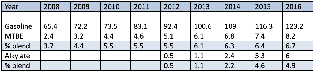 Because of the urgent requirement for higher quality and clean octane, China accelerated the domestic production of Clean Fuels (ie. MTBE, Alkylates) rapidly and the table underneath (Figure 4) shows how nationwide gasoline compositions have changed, corresponding with the timeline of the various fuel quality standard implementations: