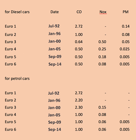 During the same time span European transportation fuels went through a number of quality changes, in terms of carbon monoxide, nitrogen oxide and particulate matter (PM) and the table below shows the chronological development of the Euro 1-6 emissions standard for diesel and petrol cars implementation.