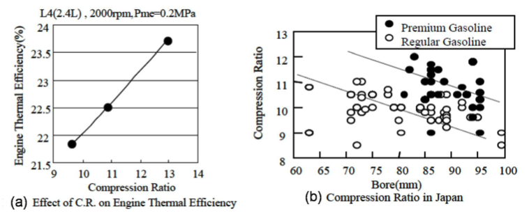 Thus, higher octane fuels allow fully stoichiometric operation at high speeds and high load in the absence of exhaust temperature limits to protect turbines or catalytic converters. The higher octane number is beneficial, then, because increasing the compression ratio (CR) provides a fuel consumption benefit across the whole engine operating map. The heuristic is that increasing the compression ratio by one decreases on-cycle fuel consumption by approximately 2%. Figure 2 shows the effect of CR on engine thermal efficiency and also shows how CR can be increased for engines that require premium fuel.