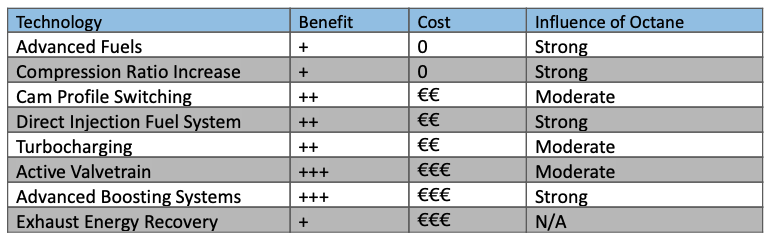 The various technologies listed in Table 2 are already being implemented by key manufacturers, although their benefits are not simply additive —some synergies are possible, as are some conflicts. As marked in the table, higher fuel octane will facilitate changes to engine compression ratio, direct injection fuel systems, and higher boost pressures from turbocharging and other advanced boost systems.