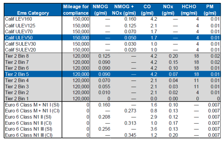 Table 1 uses data from Ricardo to show light-duty vehicle criteria pollutants for US and EU regulations.