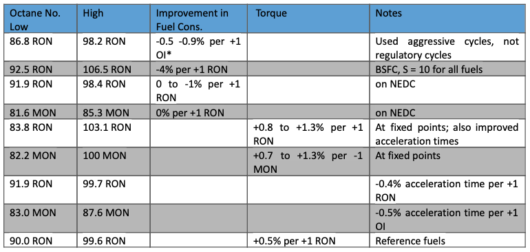 (*: OI = octane Index) Table 3. Summary of octane effects on fuel consumption and performance.