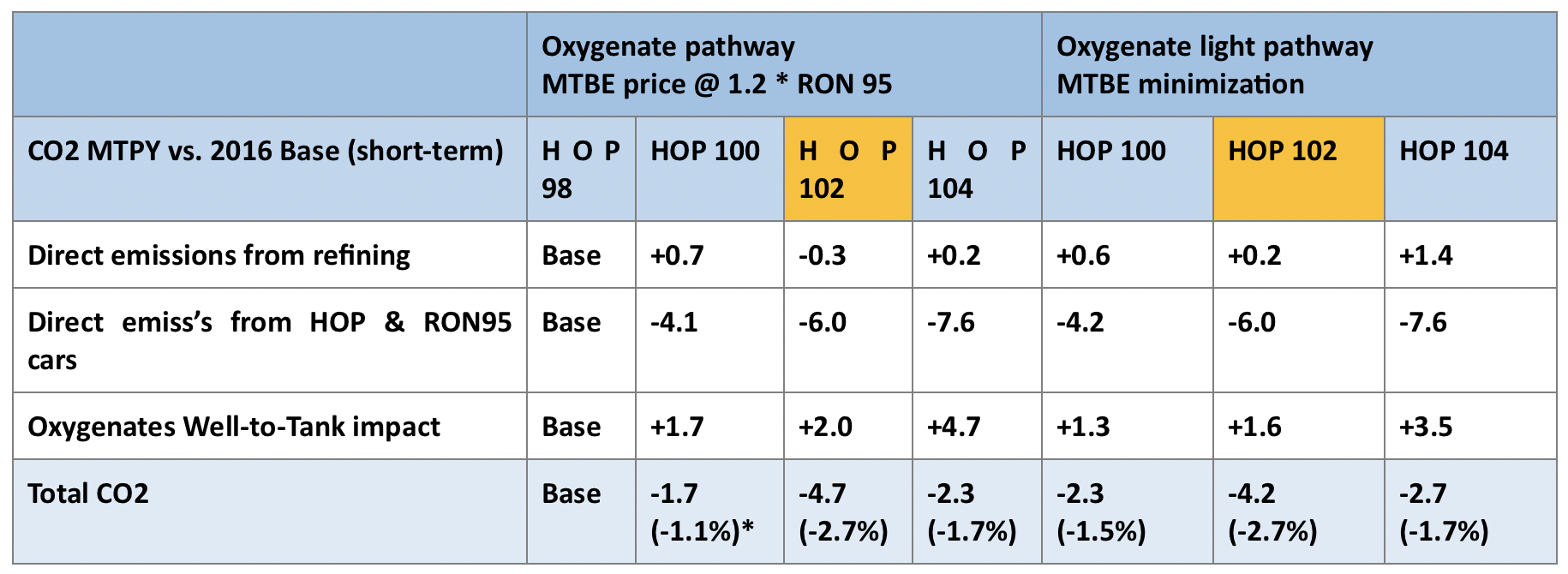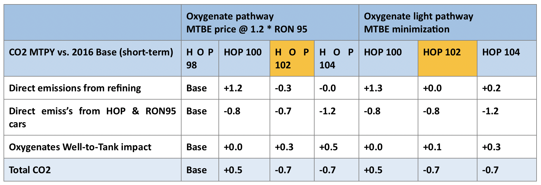While other quality grades were investigated, the CONCAWE report focuses on the HOP grade RON 102 in its case studies, which was selected as the best compromise between vehicle benefit and minimising refinery investment, in order for refineries to achieve and complete the next step towards liquid fuels quality improvement. The study concludes that: