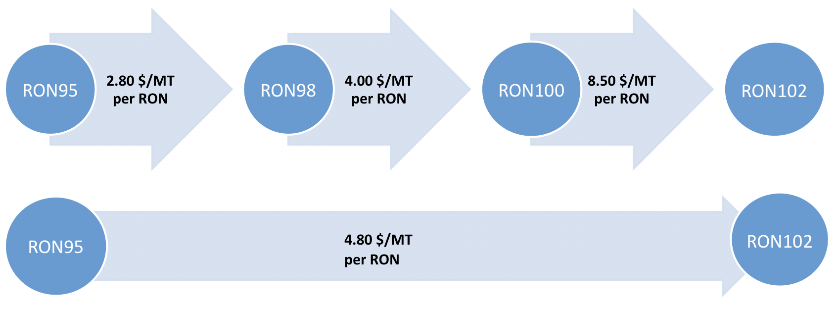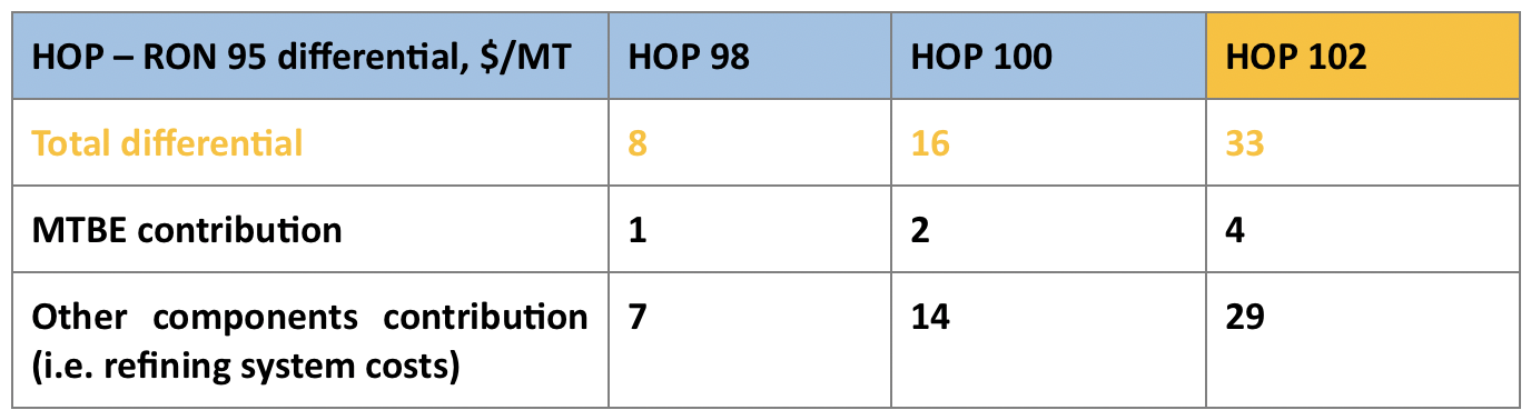 The transition from 95 RON to 102 RON will carry an octane cost estimate of 4.85 $/MT per RON point, which is by no means negligible but remains well below the market estimate conducted in the US which concluded that the cost will total 8.60 $/MT per RON point.