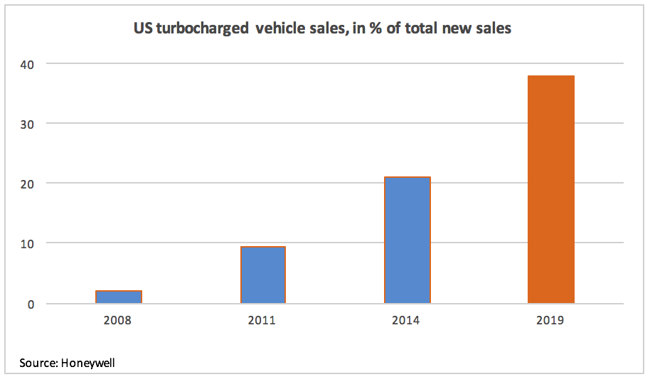 The primary global provider for turbocharging technology is Honeywell Transportation Systems. Honeywell is forecasting continued growth for turbocharged engines, not just in the U.S., but also in numerous other countries, such as China. Within North America, Honeywell indicates that turbocharged vehicle sales have grown from only 2% in 2008 to 21% in 2014 (this includes turbocharged diesel engines). Honeywell expects this to jump to 38% in 2019. As a result of this initiative, it seems likely that premium gasoline sales will continue to rise through the near future due to technological requirements for fuel economy and consumer preferences.