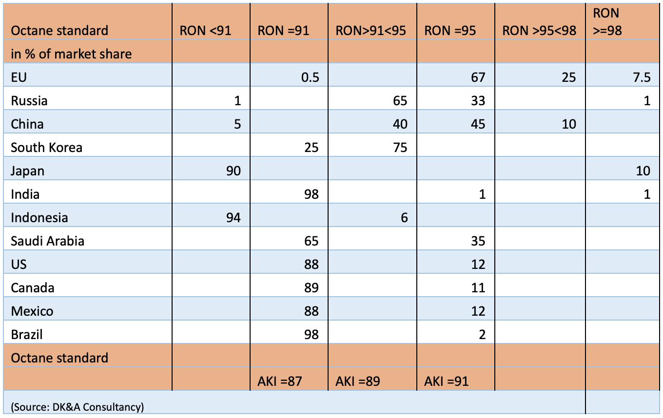 The %-market share has been clustered into the most widely used octane ranges/market segments in the international markets.
