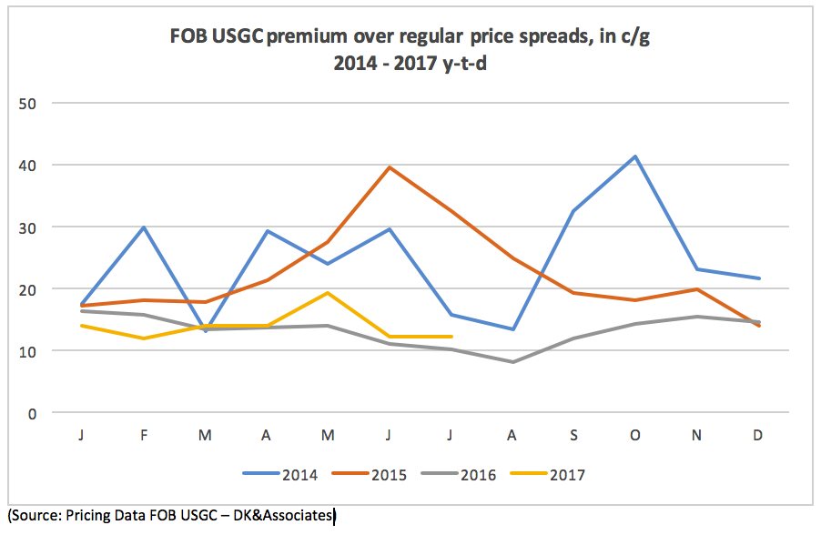 On the other hand, when looking at the price spread development in the wholesale market, the message appears rather contradictory. Price differentials between premium conventional and regular conventional have actually come down over the last 24 months, suggesting that the cost for octane has not increased at refiner/blender level. Indeed, when benchmarking gasoline blending components which are used as octane boosters against the underlying gasoline price, the same story emerges, showing no cost increase for the refiner/blender. The cost of producing higher octane grades does not produce high premiums automatically but rather supports acceptable premium pricing in the retail market. However, it must be noted that the wholesale market development is subject to other factors and cannot be directly translated into a cents per gallon price change for the consumer. The chart underneath shows the premium-over-regular spread in the US Gulf coast wholesale market from 2014 till date.